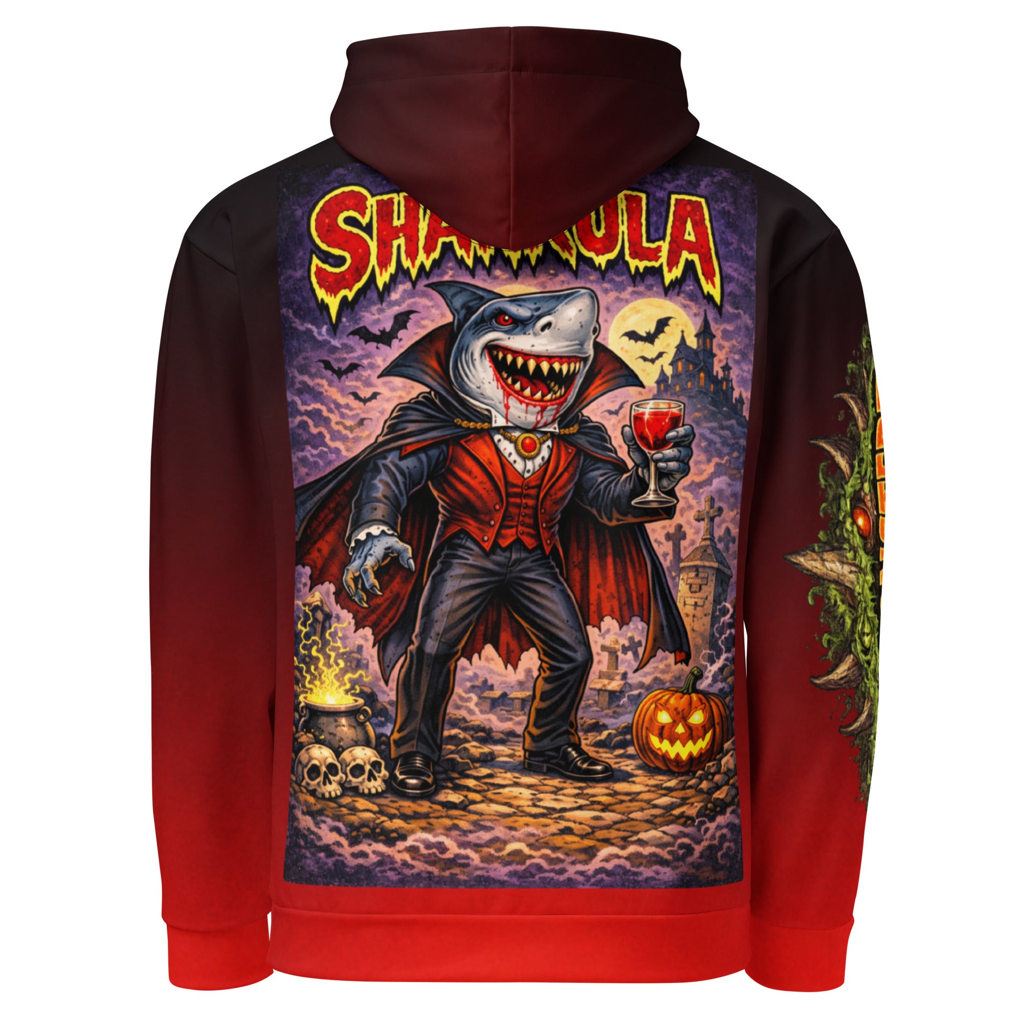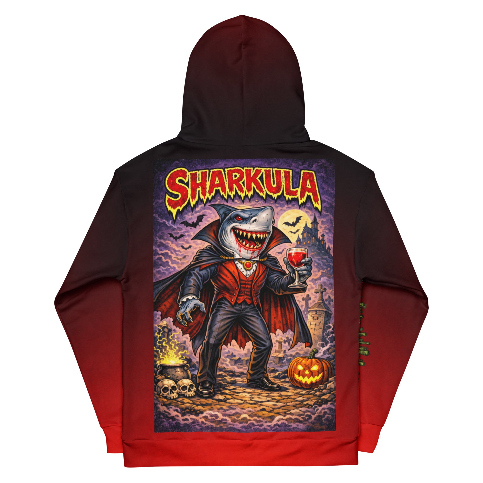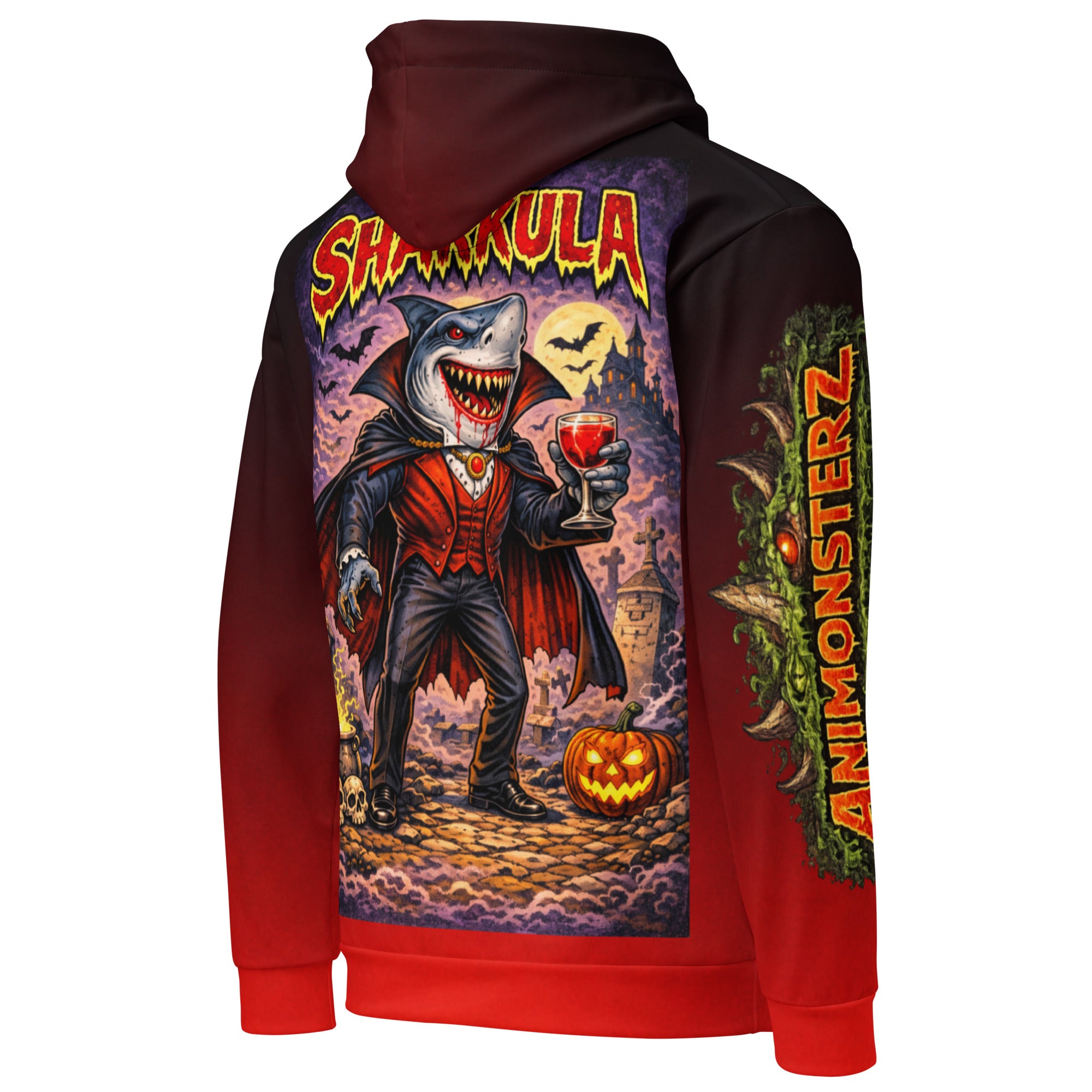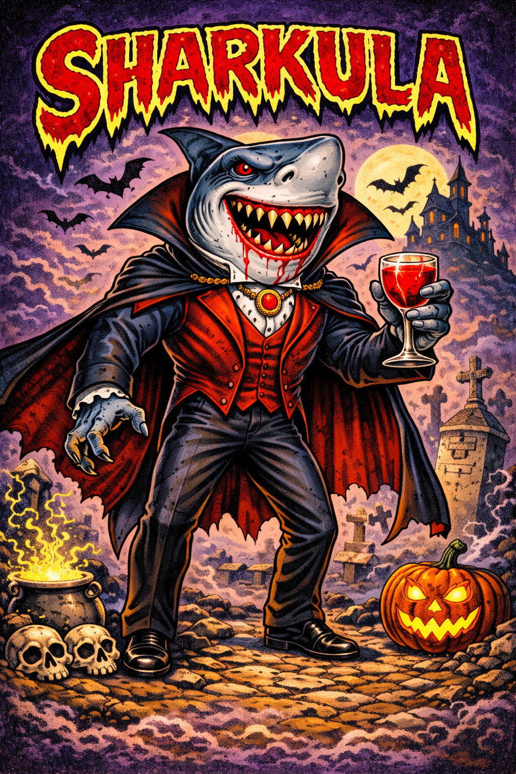 Once ruler of the deepest seas, Sharkula rose again as a predator of both ocean and night. Cloaked in aristocratic elegance and cursed with an endless thirst, he stalks graveyards and coastlines alike, savoring fear as much as blood. Charming, ruthless, and immortal, he feeds not only on flesh—but on dominance.