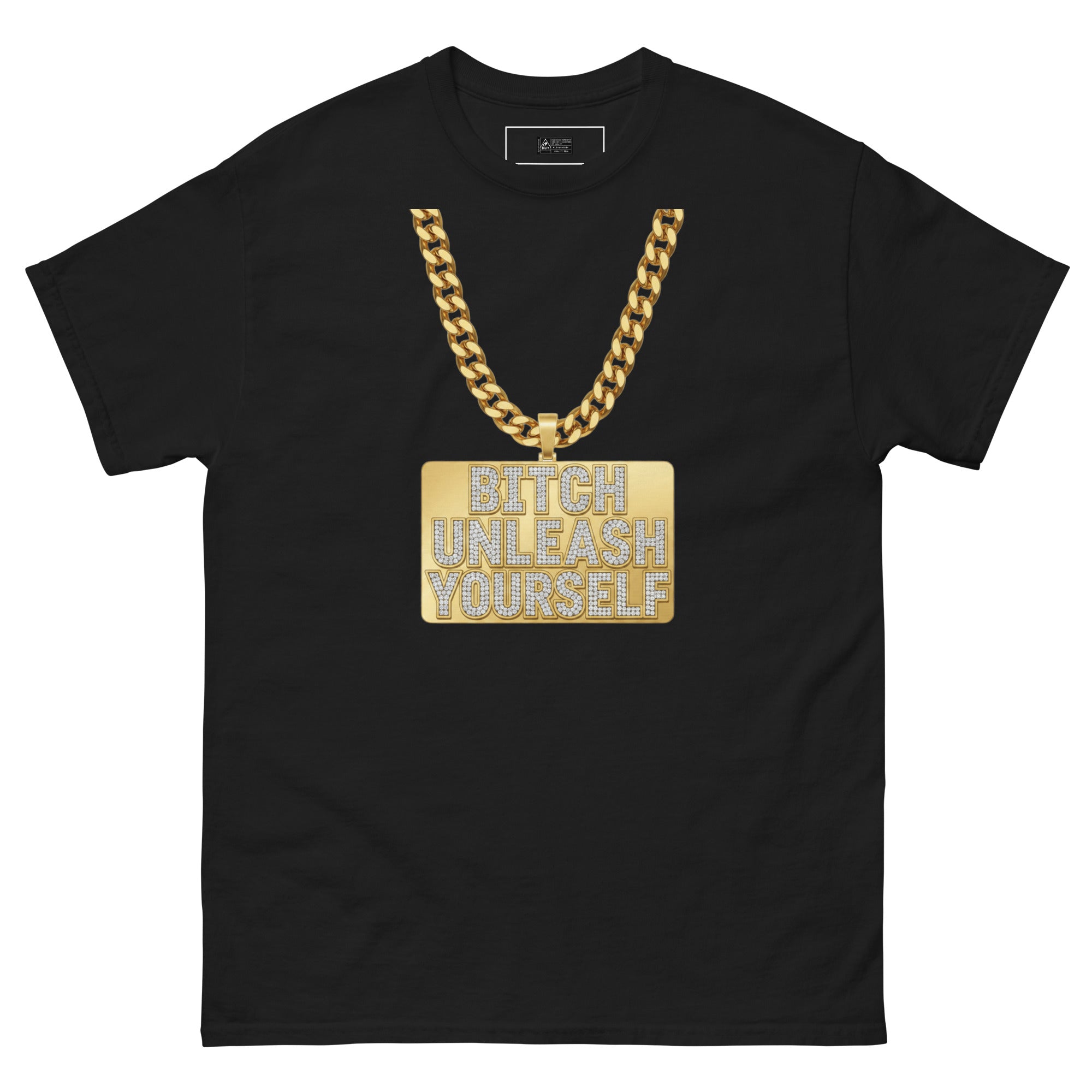 Black t-shirt with gold chain and 'Bitch Unleash Yourself' pendant on a white background