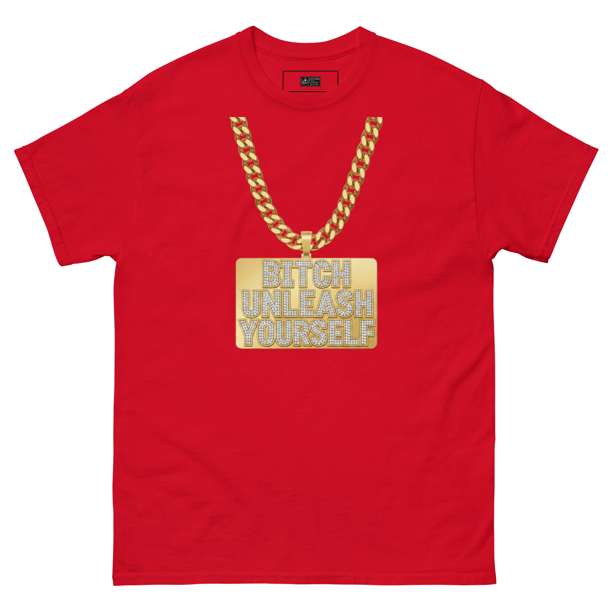 Red t-shirt with a gold chain and 'Bitch Unleash Yourself' text on a white background