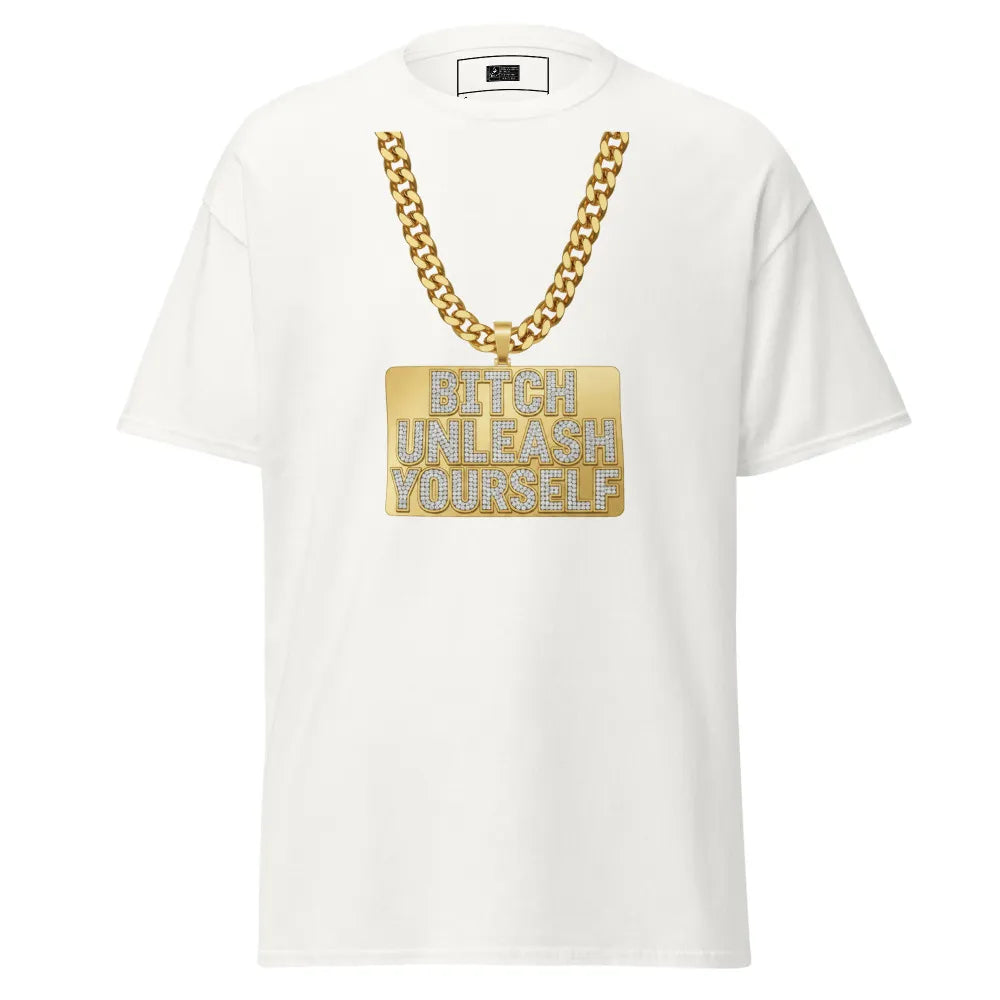 White t-shirt with gold chain and 'BITCH UNLEASH YOURSELF' text on a white background