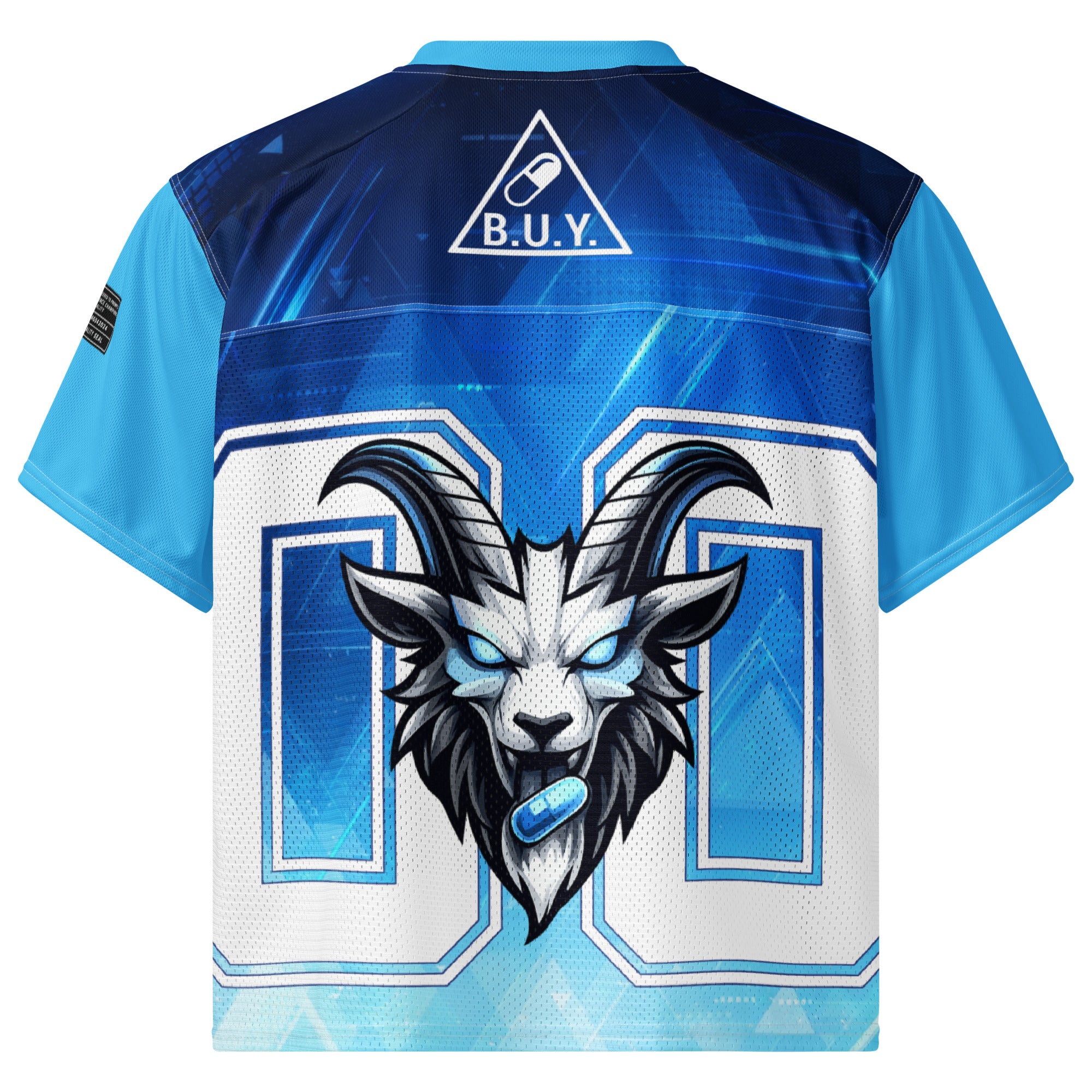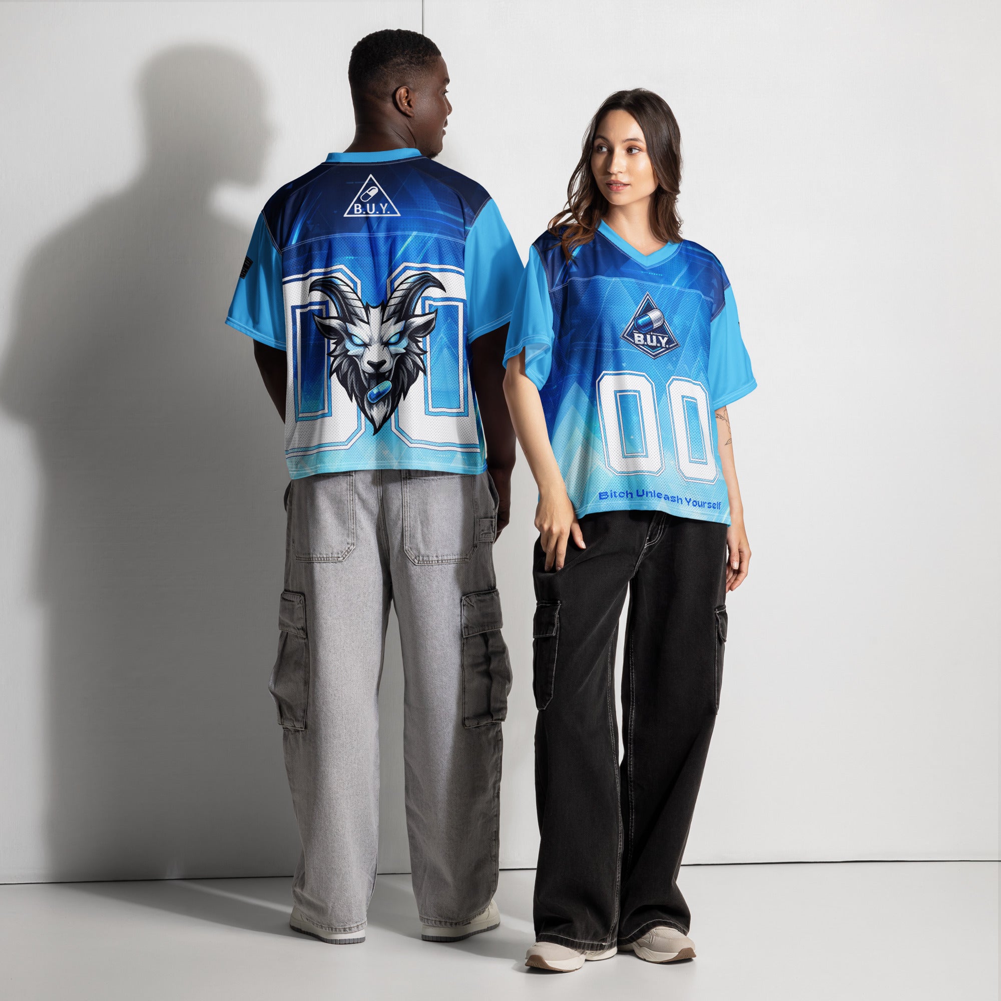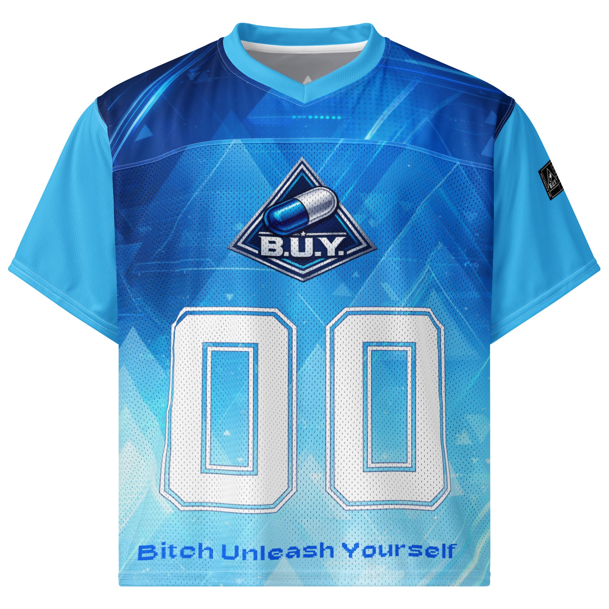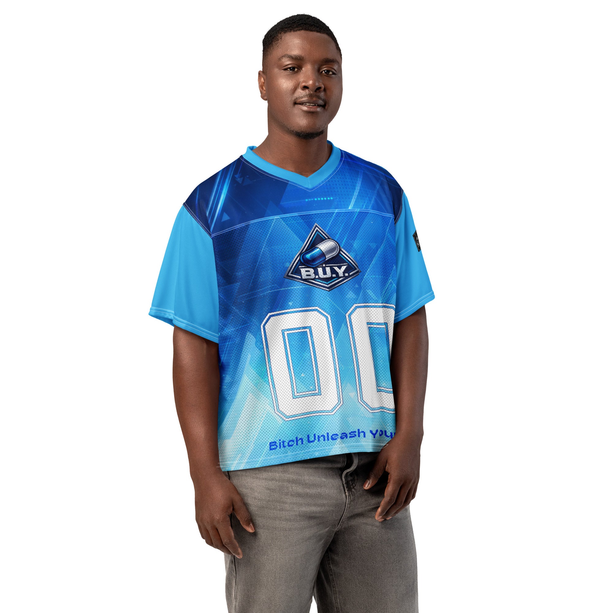 A breathable football jersey with silky top fabric and heavy mesh bottom. Moisture-wicking, 2-way stretch, and relaxed fit.